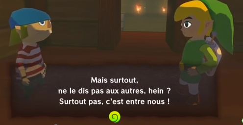 Ainsi, avec votre ami Ctrl+F, vous pourrez taper les mots "secret" ou encore "ne répète" ("don't tell" pour les versions anglaises) ou des trucs qui se rapprochent pour trouver la phrase. Quant à moi, un simple "みんな" ou encore "ナイショ" me permet généralement de trouver ce que je veux dans les versions jap. C'est ce qui m'a permis de trouver celle de LADX, et qui m'a aussi permis d'affirmer avec certitude qu'il n'y a rien de ce dialogue dans LA N&B. Par contre, il faut bien se dire que ça donne le dialogue mais pas la personne qui le dit. A partir de là, il faut chercher dans le jeu pour voir où c'est. Mais généralement, regarder les dialogues autour aide à situer à peu près l'emplacement de la phrase pour peu que l'on connaisse bien le jeu .